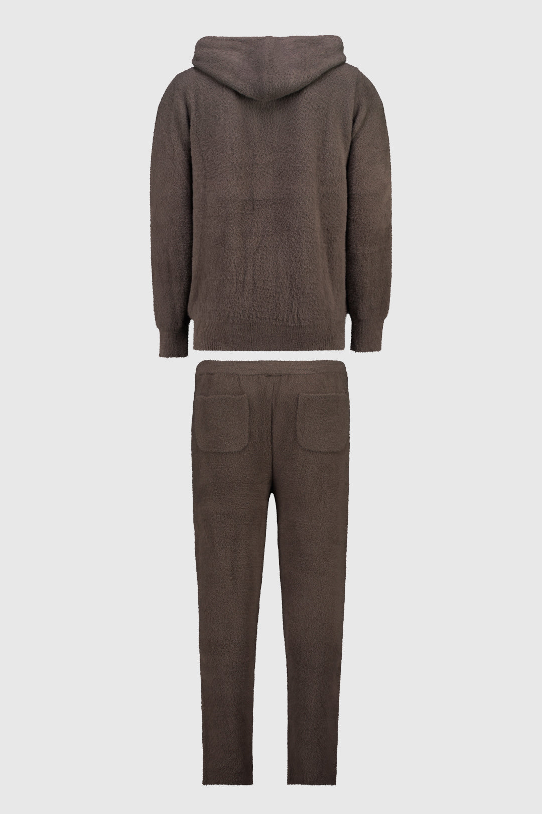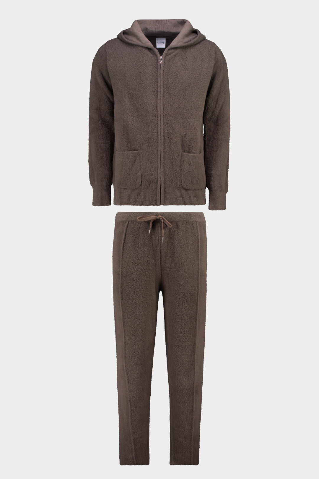 Der taupefarbene Lounge-Anzug ist ein luxuriöses und bequemes Ensemble, das sich sowohl zum Entspannen als auch für ungezwungene Ausflüge eignet. Es umfasst eine stilvolle Weste mit flauschiger Außenseite, Baumwollinnenseite, einem einzigartigen, maßgeschneiderten Reißverschlussschieber, Vordertaschen, Boxed-Passform und geripptem Bund. Ergänzt wird die Weste durch die passende Lounge-Hose mit ähnlich flauschiger Textur, bequemer längerer Länge, Gesäßtaschen und einem Design, das bequem über Schuhe passt. Dieser Anzug vereint Eleganz und Zweckmäßigkeit und ist somit die ideale Wahl für alle, die bei ihrer Freizeitkleidung Wert auf Raffinesse legen.