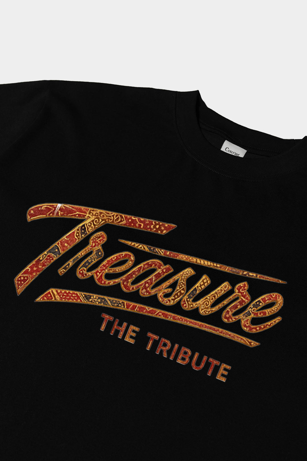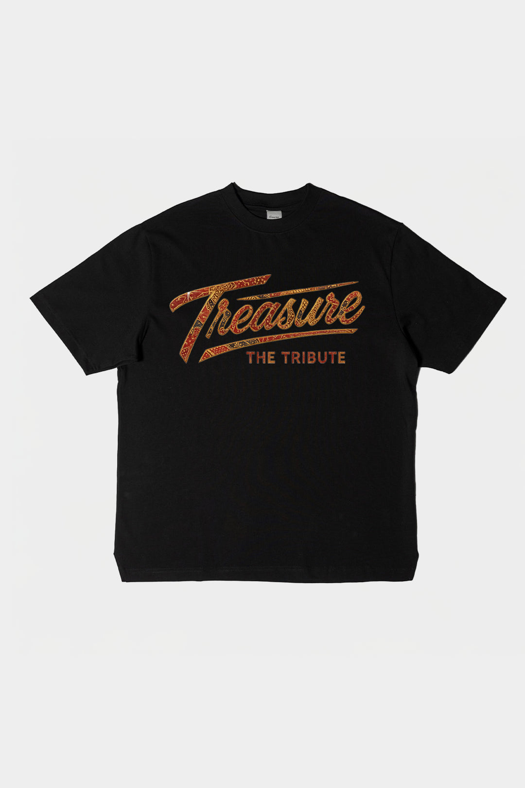 Een eerbetoon aan muzikaliteit, identiteit en vakmanschap. Dit oversized T-shirt is het officiële resultaat van de samenwerking tussen Treasure – The Tribute en Courier Atelier.