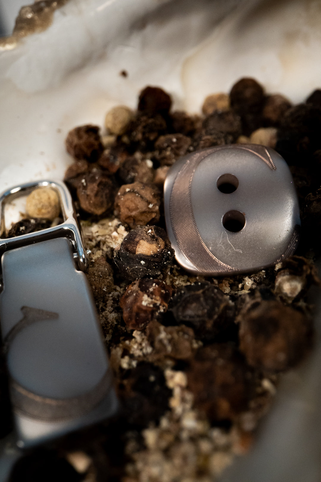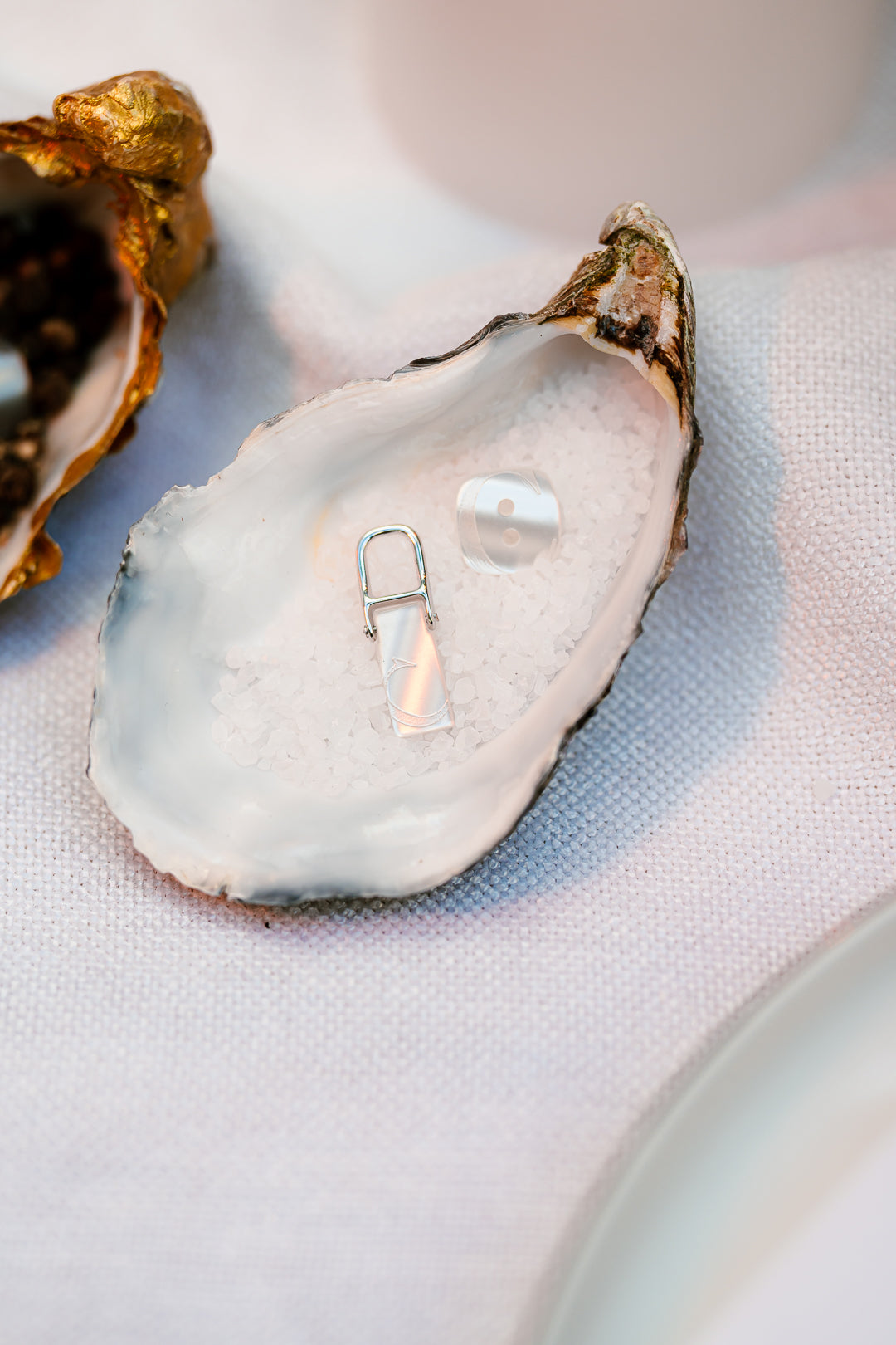 Our custom zipper pullers are crafted in a sleek, rectangular shape with a subtle minimalist logo, they embody class and sophistication. Made from the same pearl-like material to perfectly match our buttons.