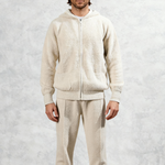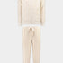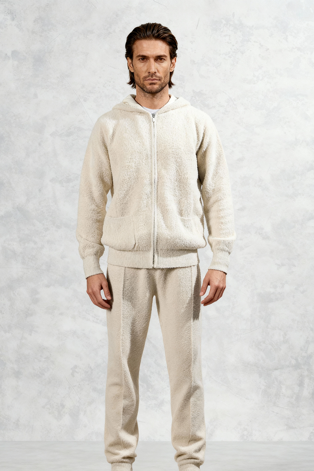 The Vanilla White Lounge Suit is a luxurious and comfortable ensemble, perfect for both relaxation and casual outings. It includes a stylish vest with a fluffy exterior, cotton interior, a unique custom zipper puller, front pockets, boxed fit, and ribbed waistband.