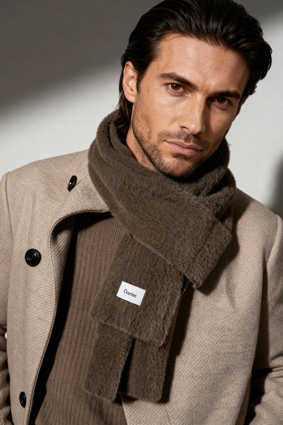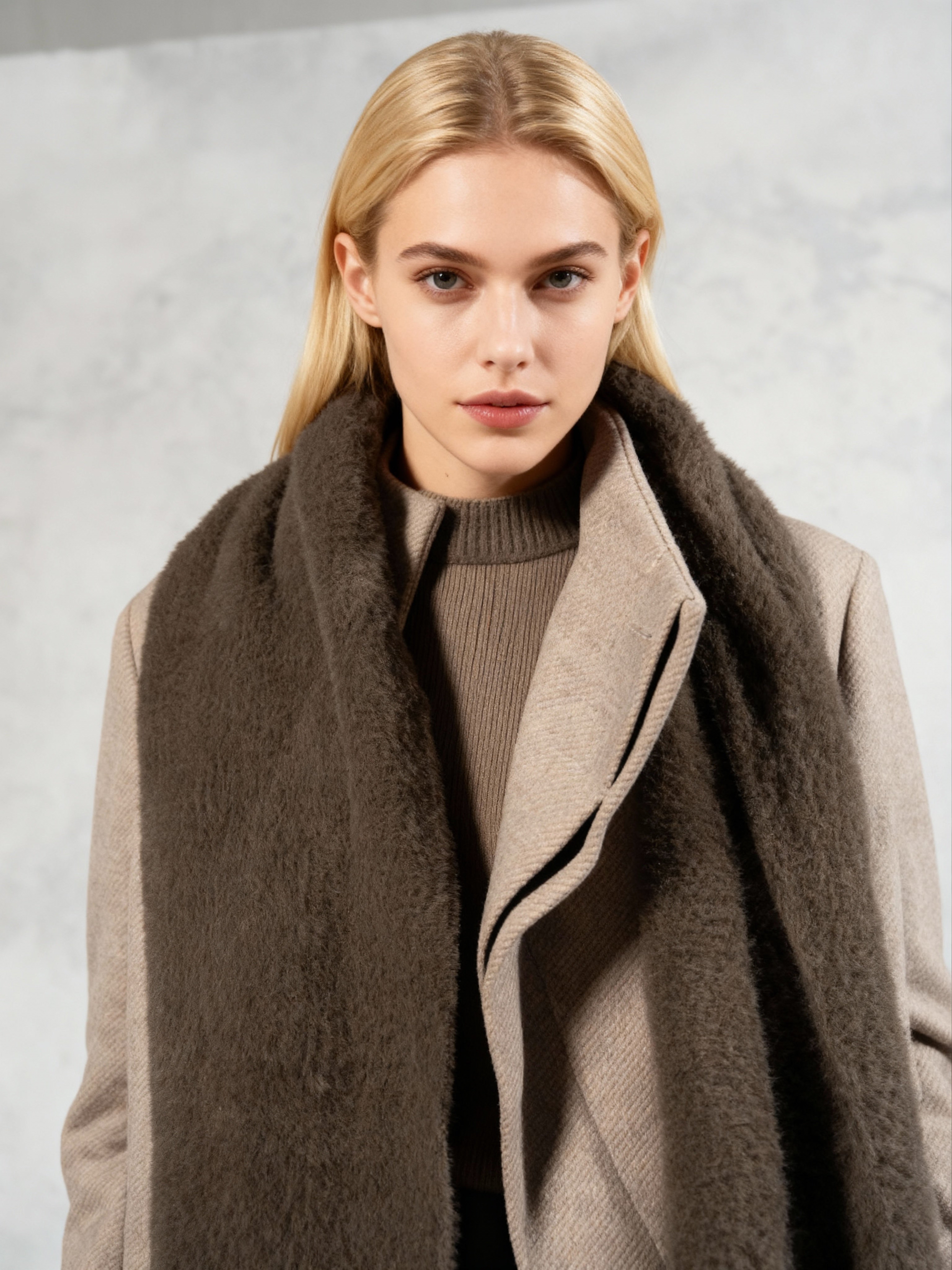 Our Taupe Scarf featuring a luxurious, soft fluffy texture on both sides. for a elegant and cozy feel, perfect for enhancing both your style and comfort.
